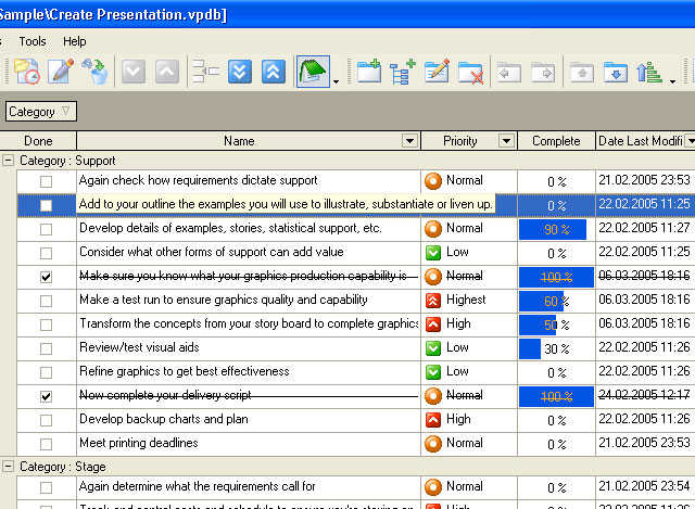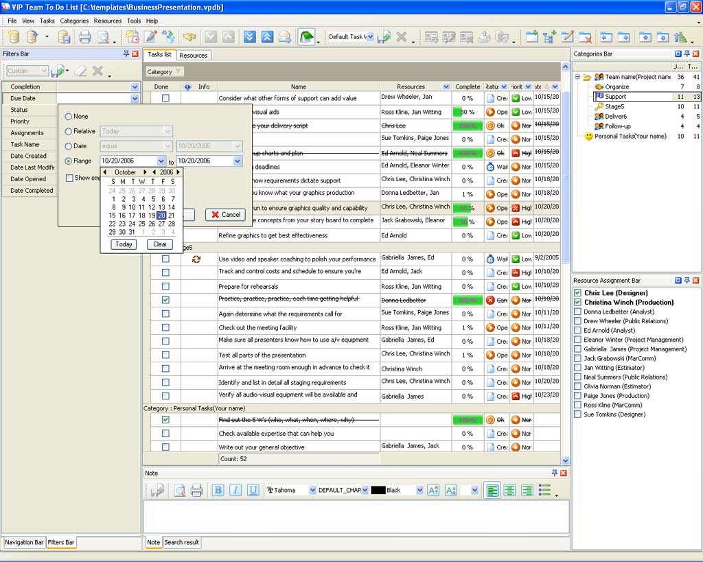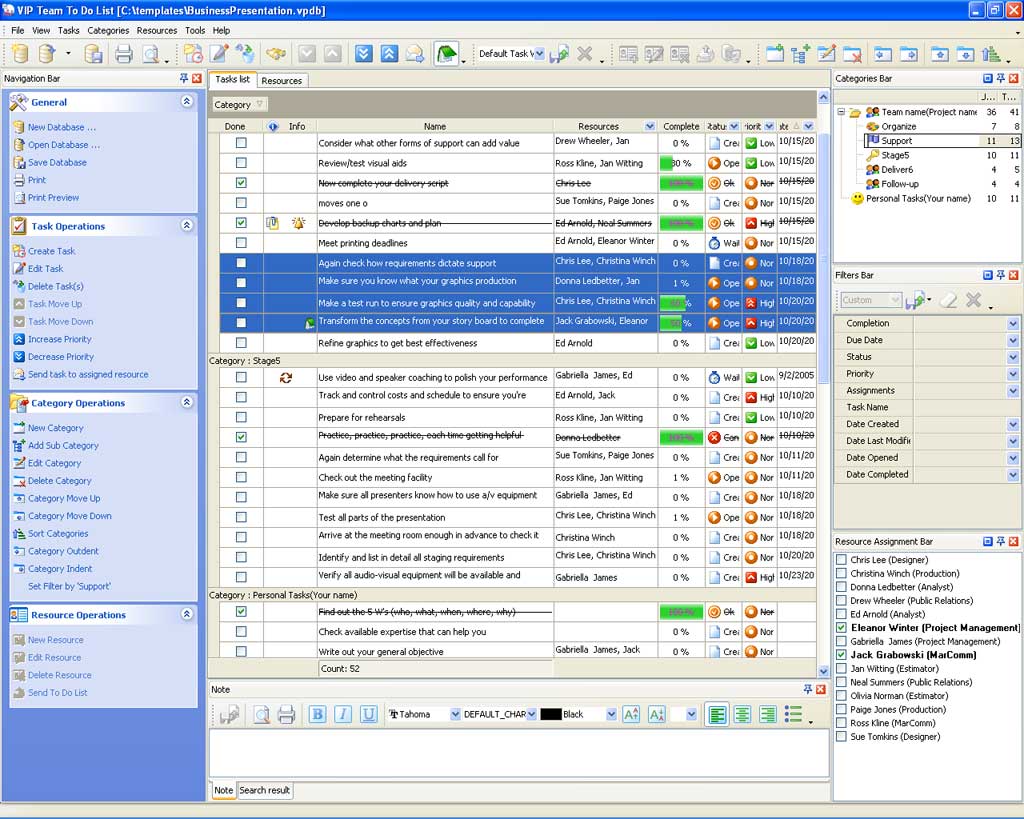 For trackingtasks progress VIP Teem To Do List offers the following tools: ‘Done’, Complete %, Status and Info columns where you can define and track status of tasks.