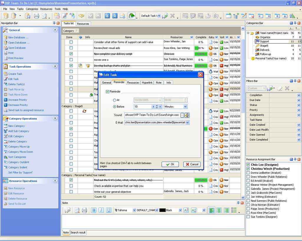 You can set To Do List reminders in the form of message, melody, or send an e-mail with task reminder to computer or mobile phone of assigned resource. Reminder can be set both for definite time and for some period before that time.