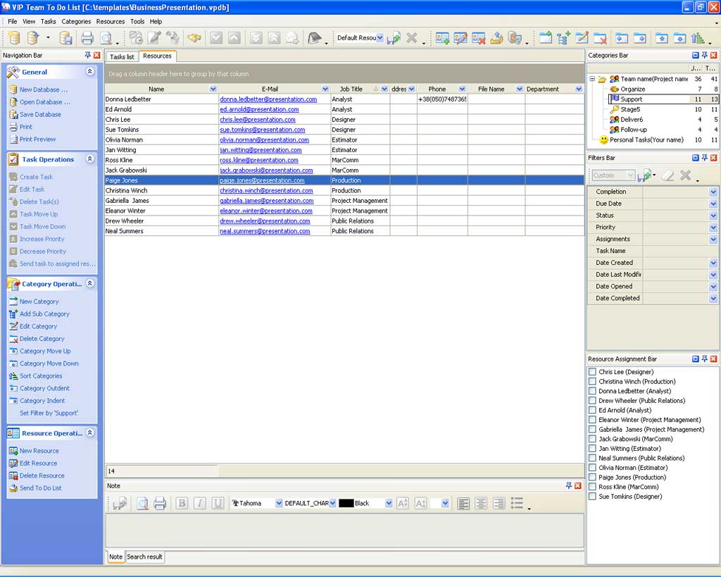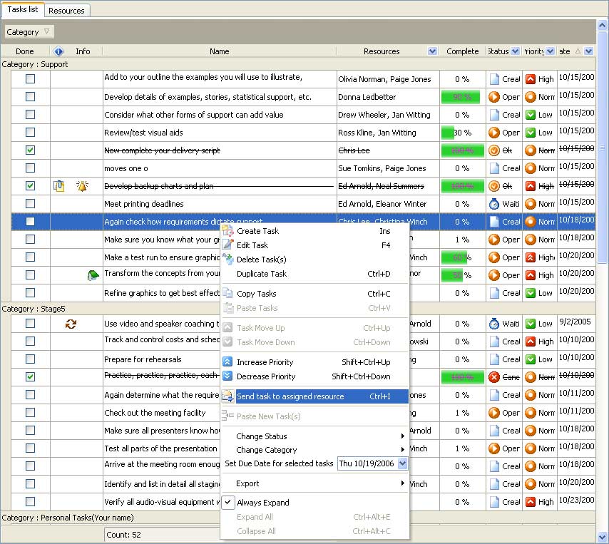 Resource list allows quickly creating and editing of resources, as well as using filters, sorting, printing and exporting it to various formats. You can easily assign resources to a task from the floating panel by using ‘drag&drop’ method or Edit Task dialog.