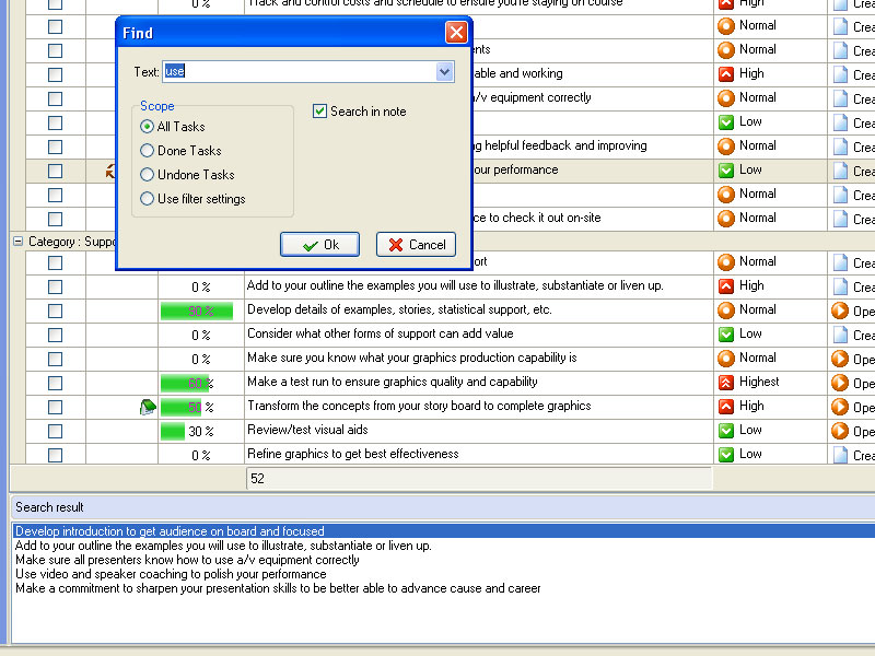 Working with big size To Do Lists you can easily find necessary task by using Text Search Engine.