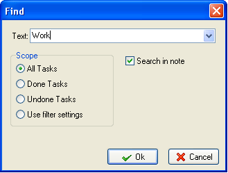 Enter the word for search in the Text field. Then you can choose the range of tasks from the Scope field (All Tasks, Done Tasks, Undone Tasks or Use filter settings). Also you can check the field "Search in note" to search text even in tasks notes.