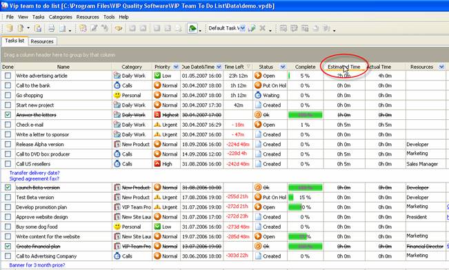 To track your tasks by their estimated time click on ‘Estimated Time’ column header on Task List grid. You can sort the tasks from minimal estimated time to maximum one and vice versa.